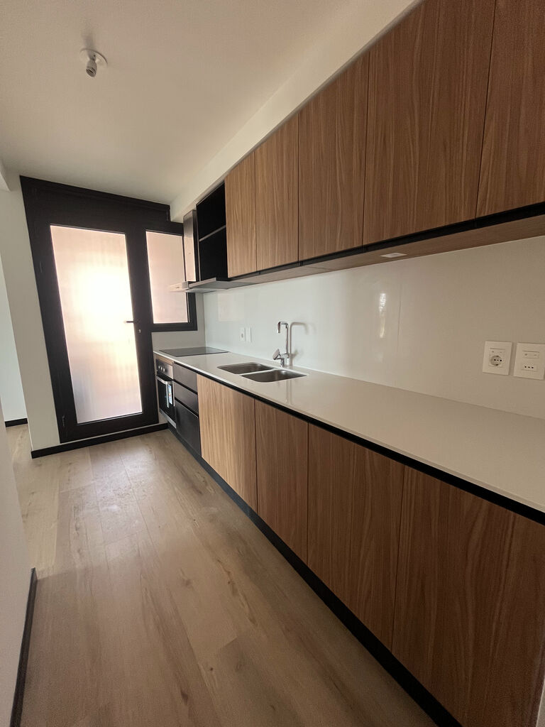Cocina definida, con muebles bajo y sobre mesada, equipada con horno empotrado, anafe y campana extractora